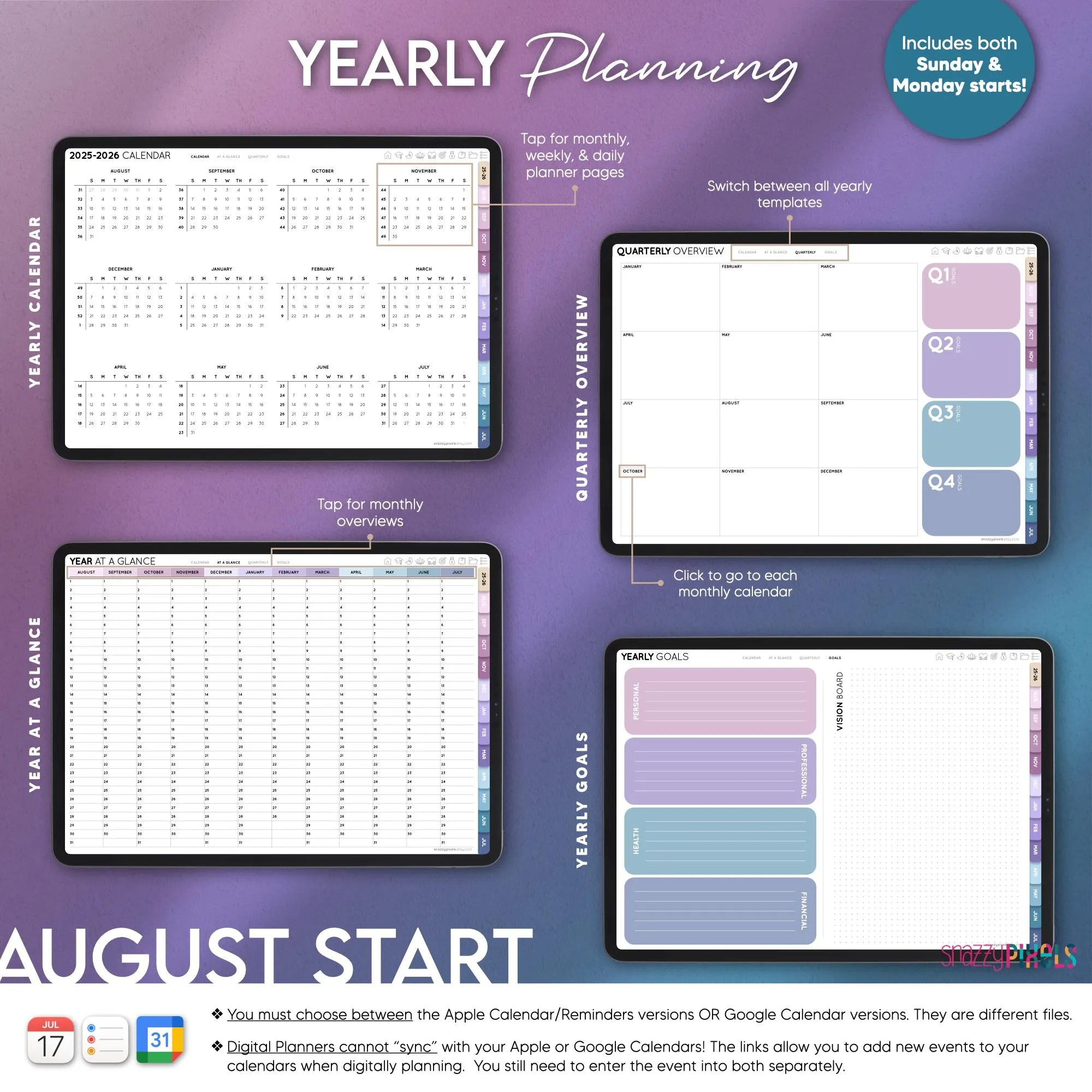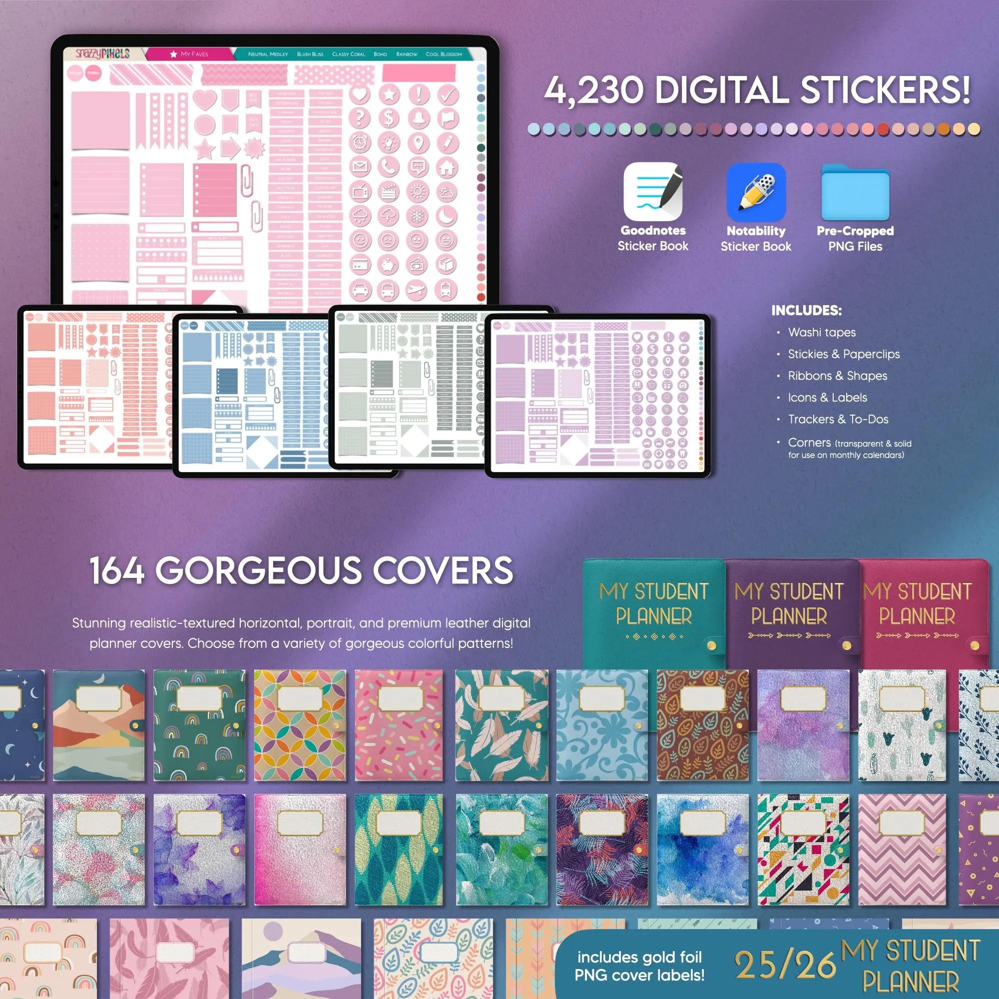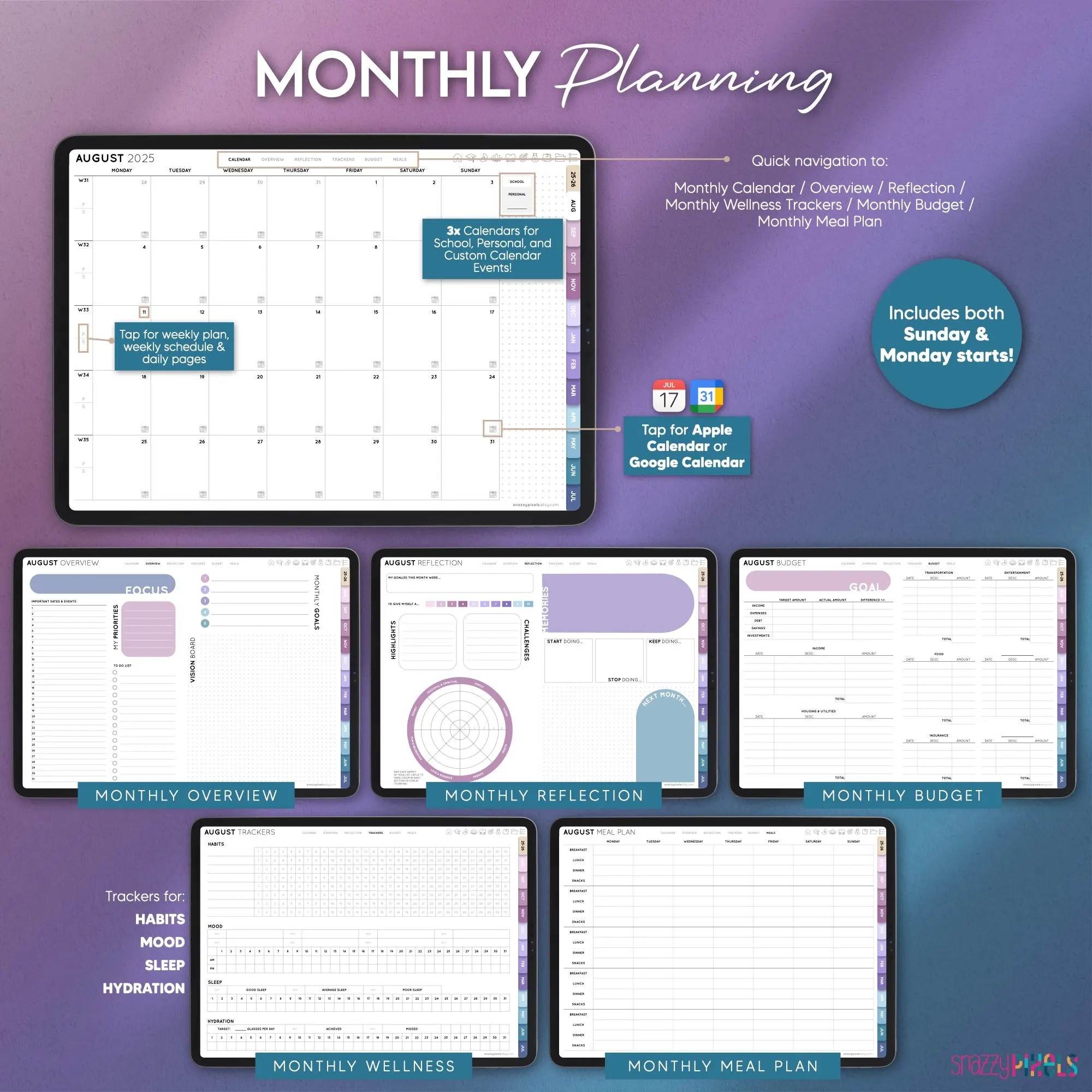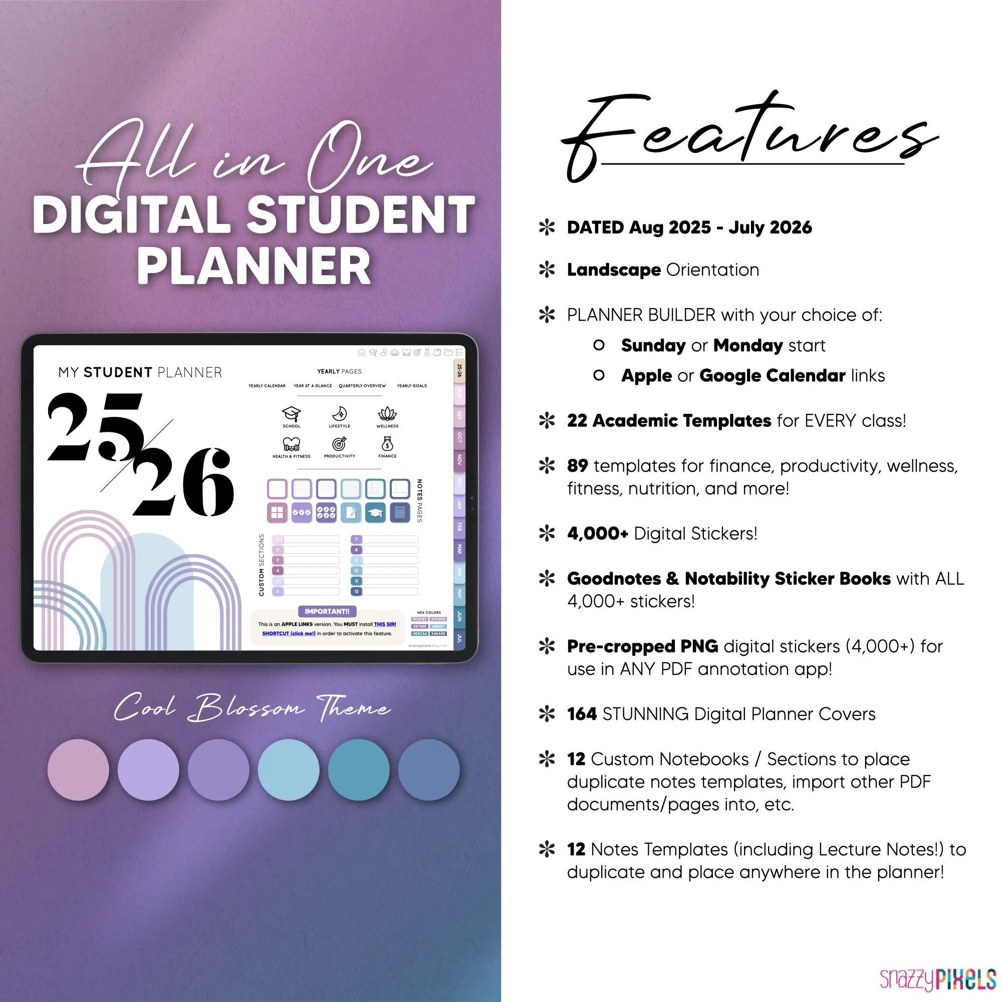 This Aug 2025 – July 2026 ALL-IN-ONE Digital Student Planner has everything you need to keep your personal, academic, and professional life organized! It includes over 104 planning and tracker templates that’ll help you ACE your classes this year, tackle your finances, track your goals & projects, your wellness, fitness, and more! With a whopping 1,284 fully-hyperlinked pages, you’ll have your most productive school year yet!