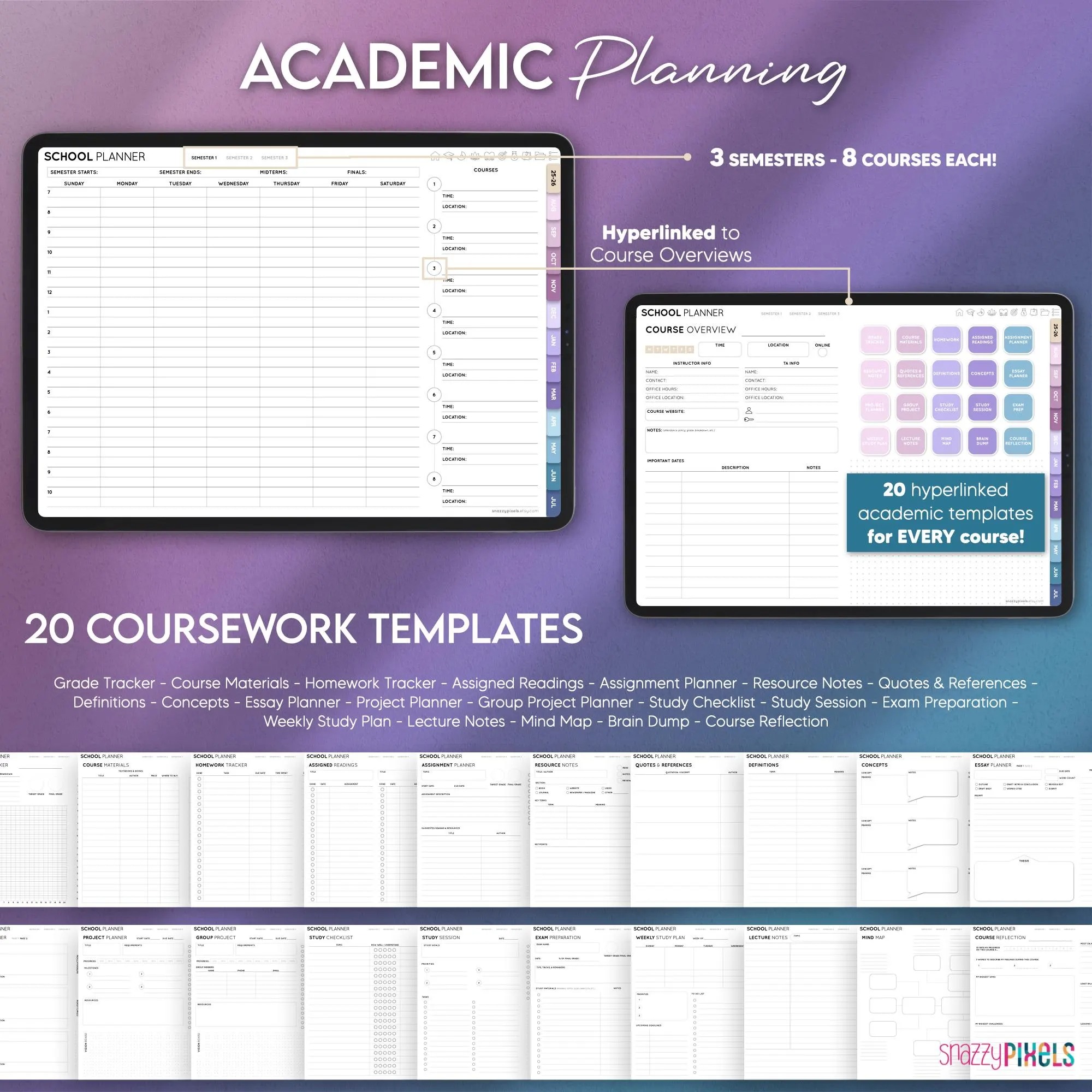 Semester Schedules (x3) / Course Overviews / Grade Tracker / Course Materials / Homework Tracker / Assigned Readings / Assignment Planner / Resource Notes / Quotes & References / Definitions List / Concepts List / Essay Planner / Project Planner / Group Project Planner / Study Checklist / Study Session Tracker / Exam Preparation / Weekly Study Plan / Lecture Notes / Mind Map / Brain Dump / Course Reflection