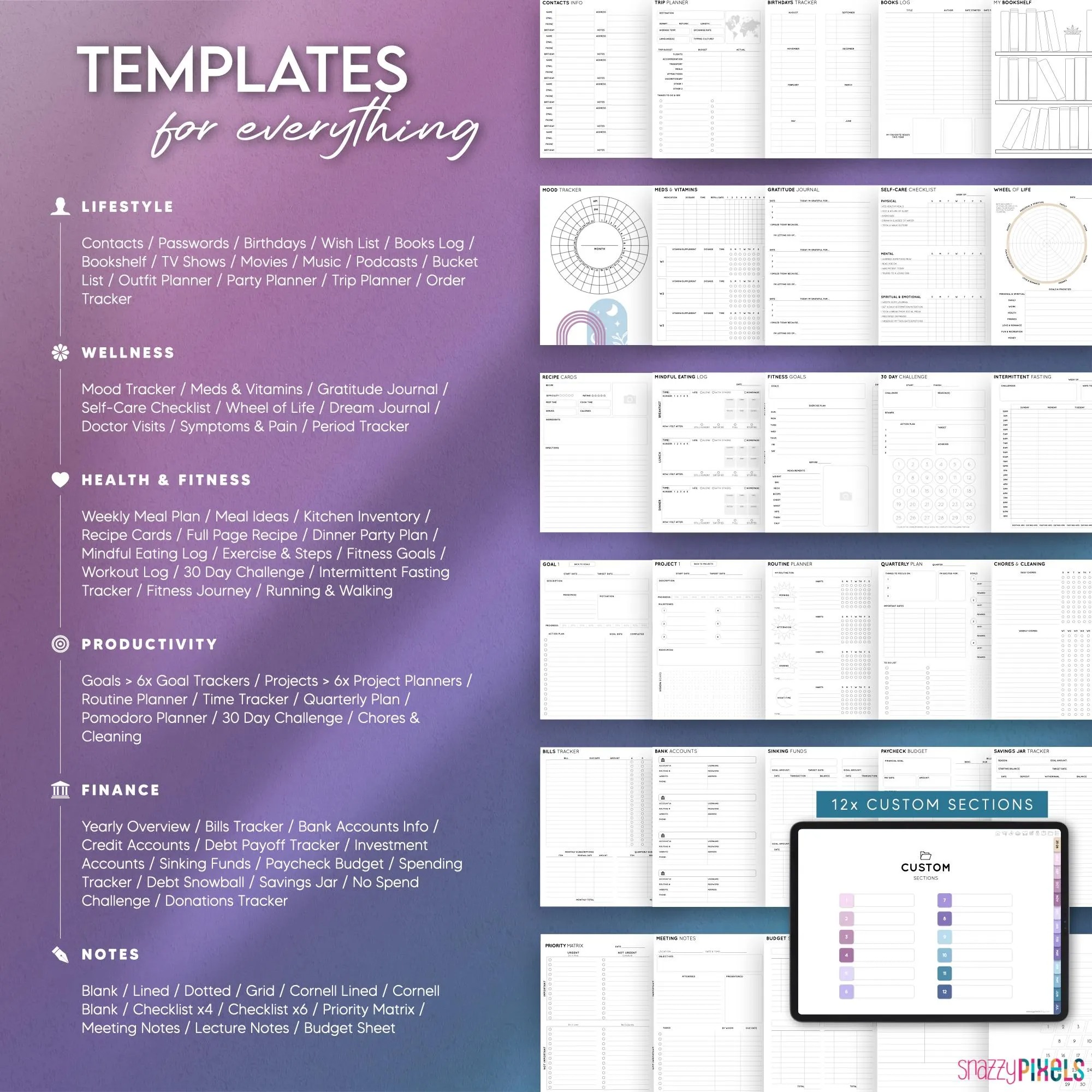 Contacts / Accounts / Passwords / Birthdays / Wishlist / Books Tracker / TV Shows Tracker / Movies Tracker / Music Tracker / Podcasts Tracker / Outfit Planner / Trip Planner / Online Order Tracker / Bucket List / Party Planner