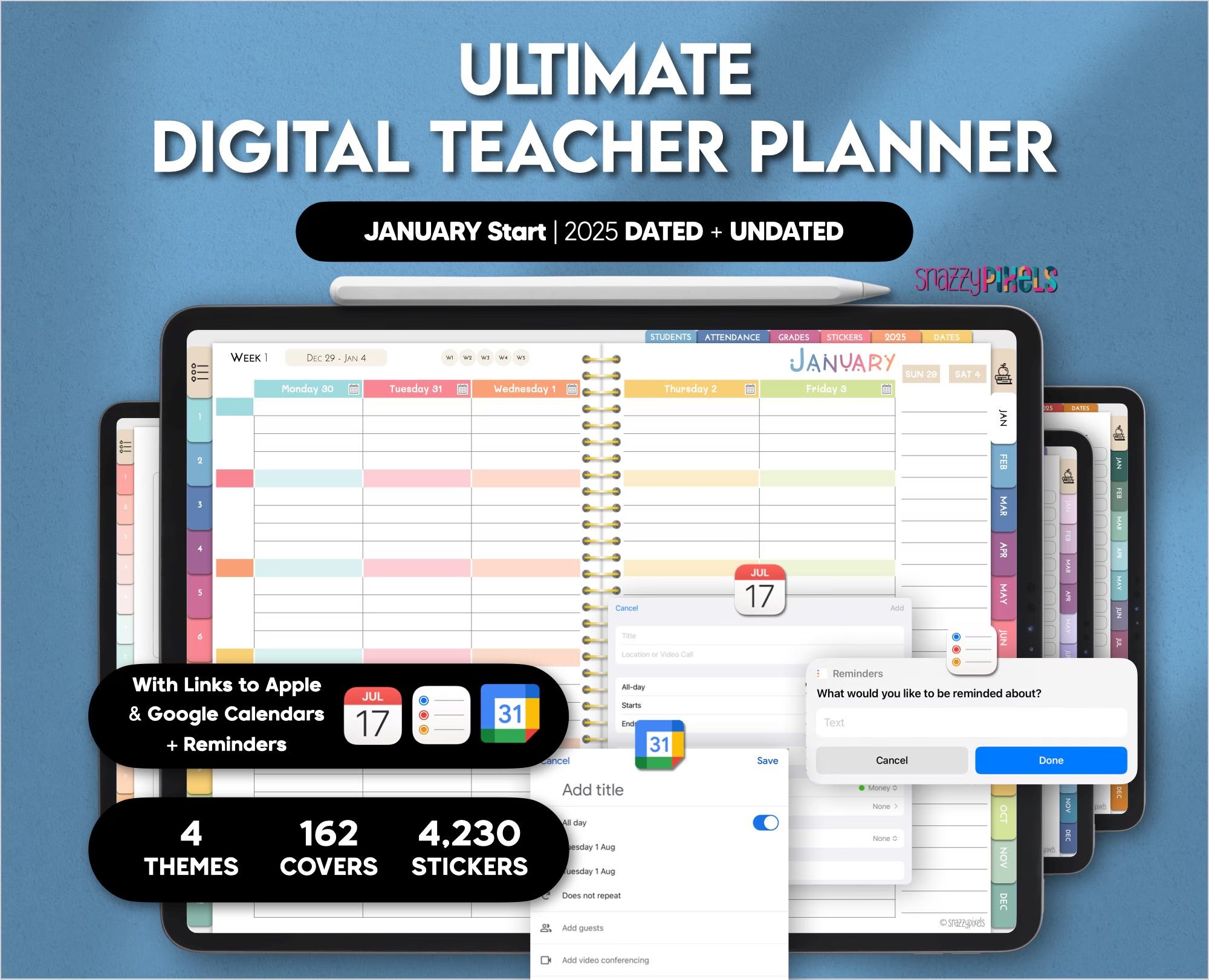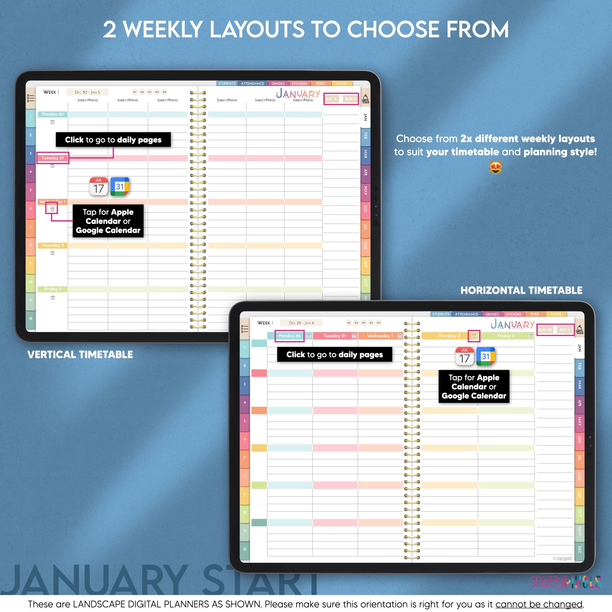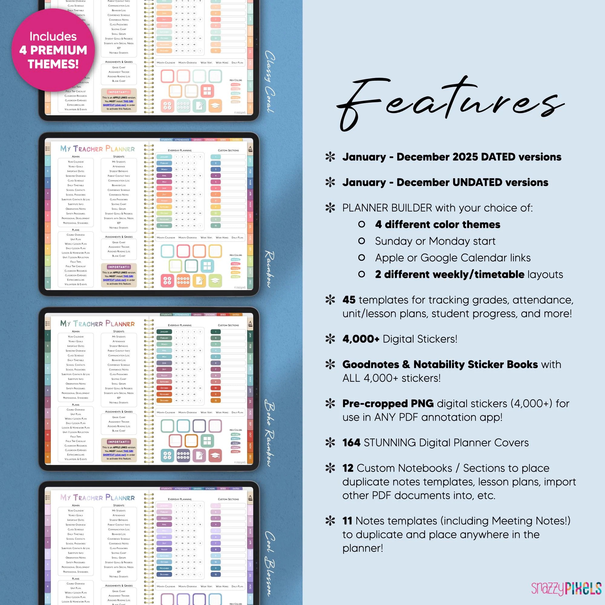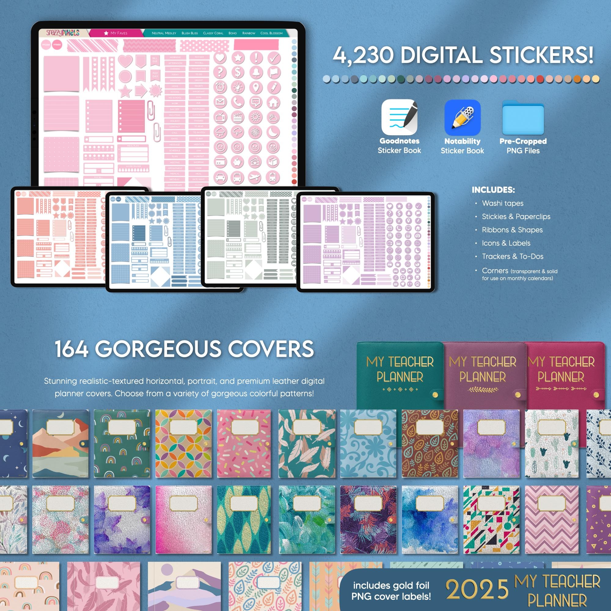 This DATED Jan-Dec 2025 & UNDATED Digital Teacher Planner is the ULTIMATE lesson planning experience! Designed with UI/UX in mind by an AVID digital planner user and former English teacher (me! ), it provides an incredibly seamless and intuitive planning experience so you can track your lesson plans, student information, reflect on units, and much much more! You’ll also get to try and test out both a horizontal and vertical timetable planning experience to find your perfect fit. Not to mention this Digital Teacher Planner also comes in 4 beautiful color themes, includes over 4,000 digital stickers (pre-cropped and sticker book files) and 164 stunning realistic-textured planner covers!