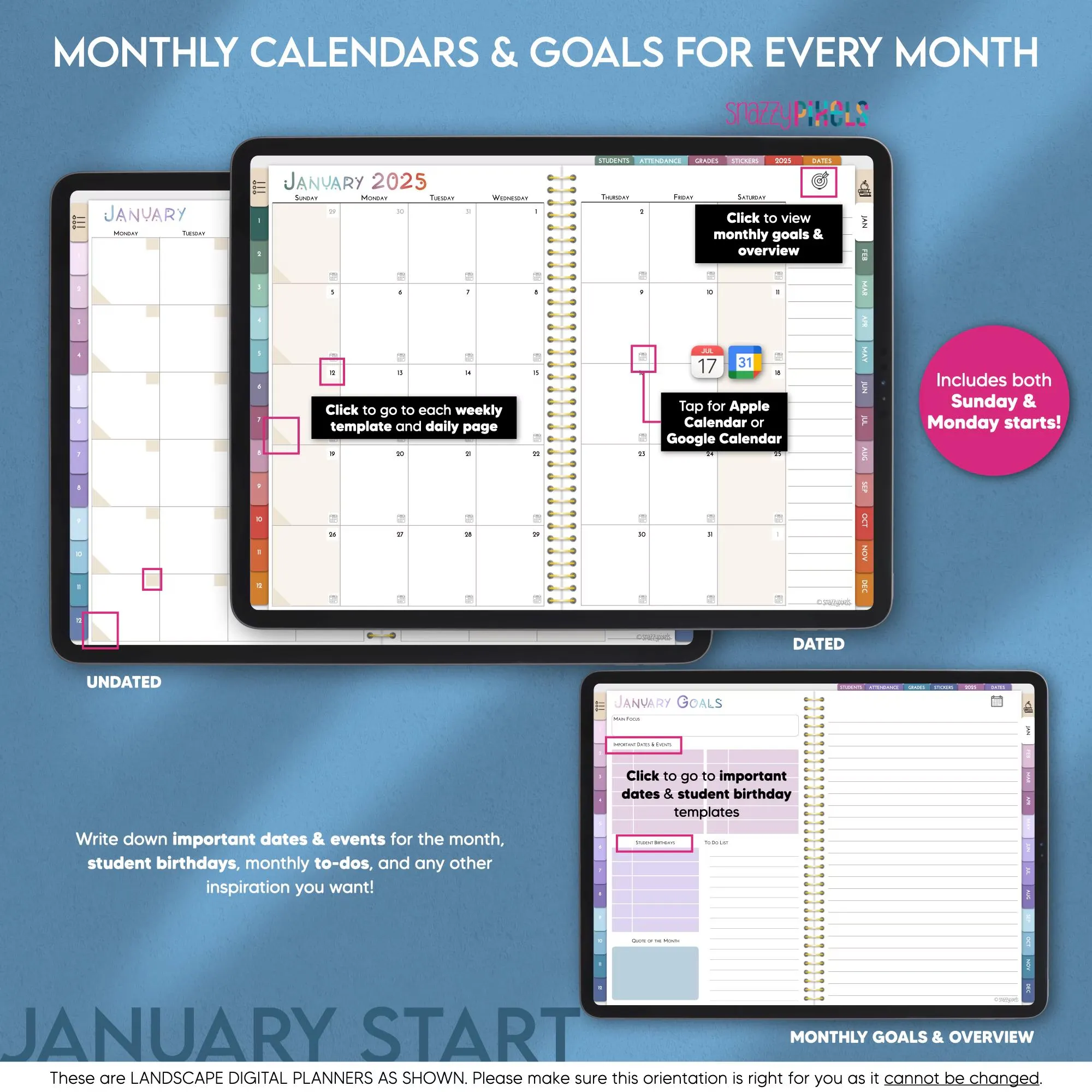 Both Sunday & Monday start versions in each planner variation!
