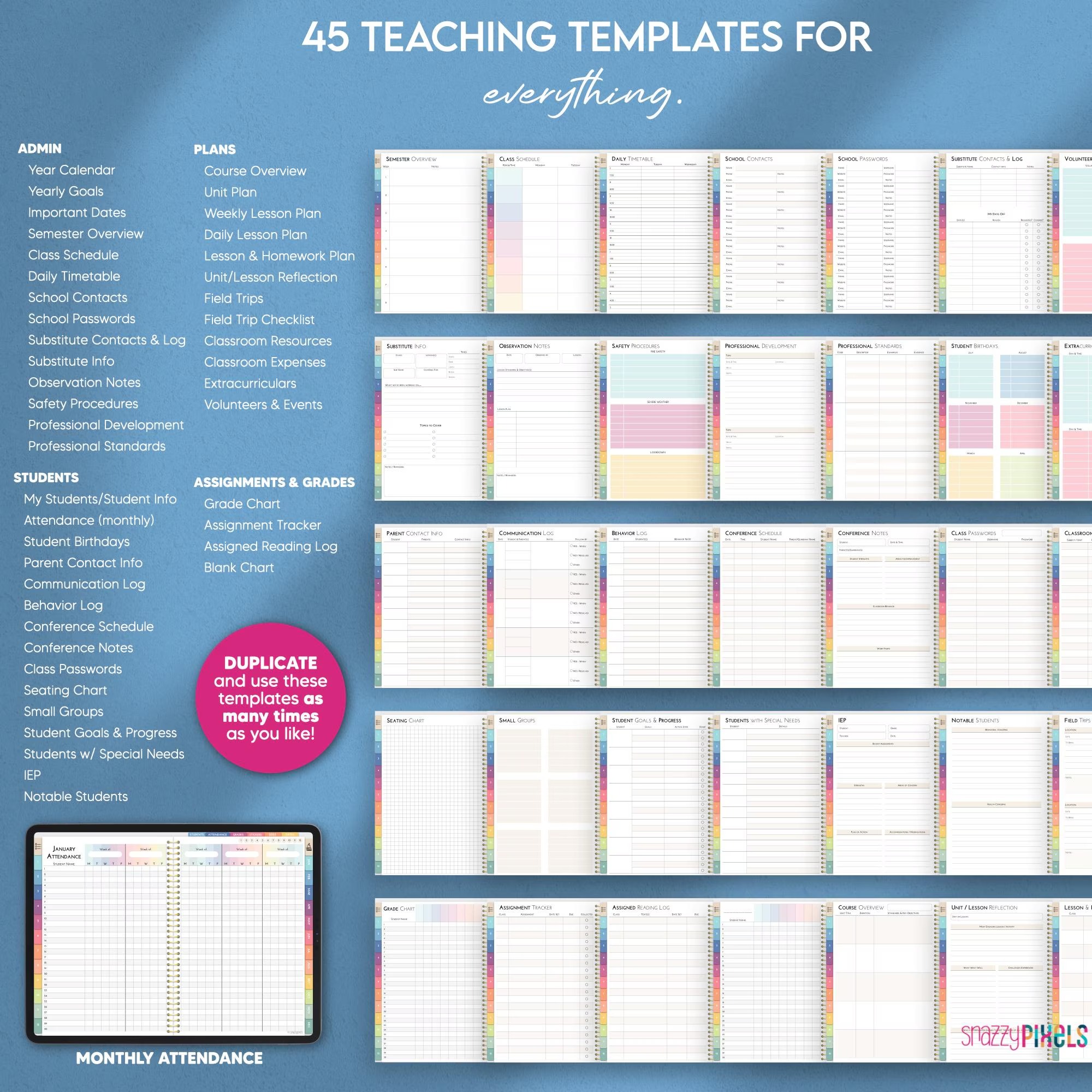 45 teaching templates including: daily/weekly/monthly lesson plans, unit plans & reflection, student information pages, monthly attendance, grade charts, and more!