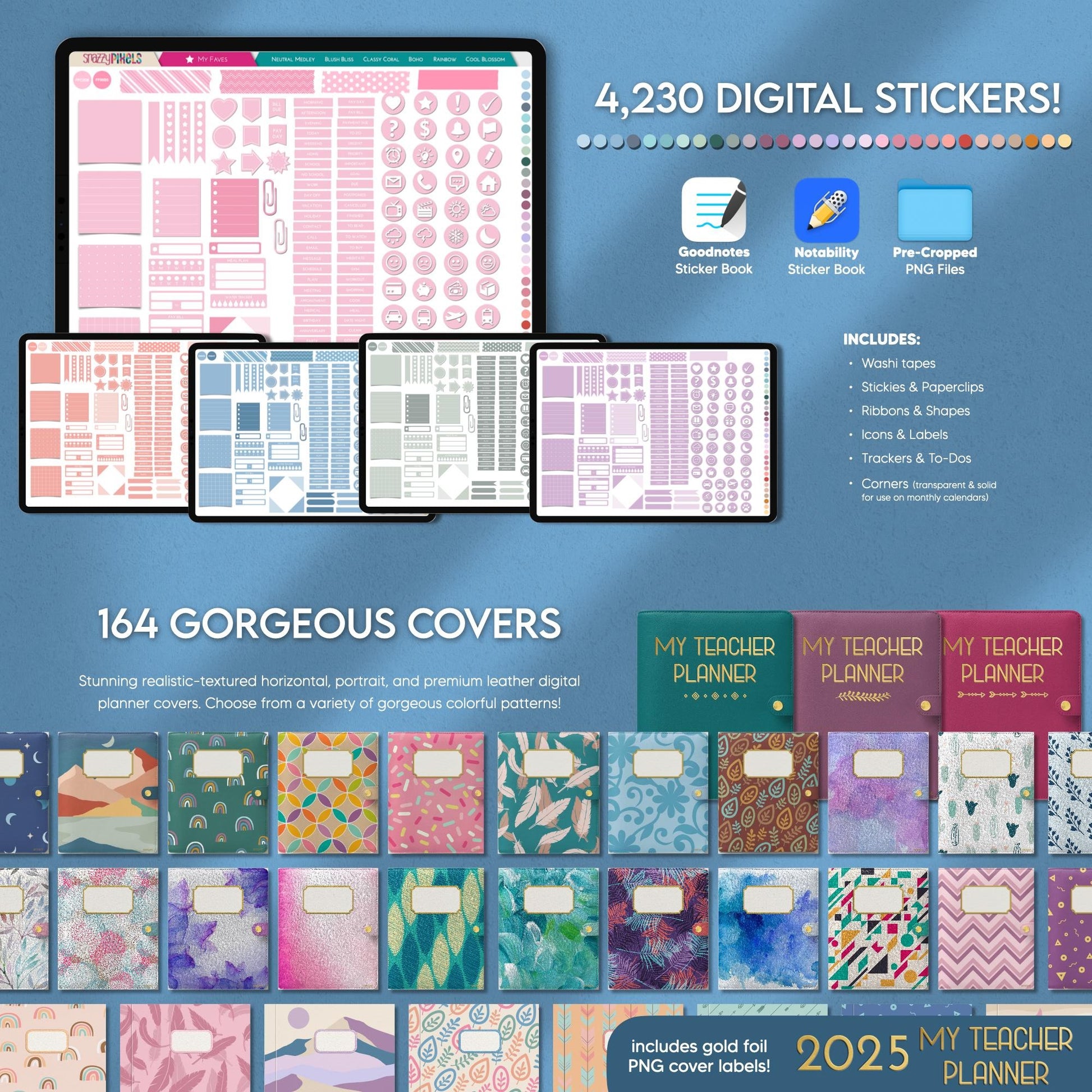 This DATED Jan-Dec 2025 & UNDATED Digital Teacher Planner is the ULTIMATE lesson planning experience! Designed with UI/UX in mind by an AVID digital planner user and former English teacher (me! ) , it provides an incredibly seamless and intuitive planning experience so you can track your lesson plans, student information, reflect on units, and much much more! You'll also get to try and test out both a horizontal and vertical timetable planning experience to find your perfect fit. Not to mention this Digital Teacher Planner also comes in 4 beautiful color themes, includes over 4,000 digital stickers (pre-cropped and sticker book files) and 164 stunning realistic-textured planner covers!